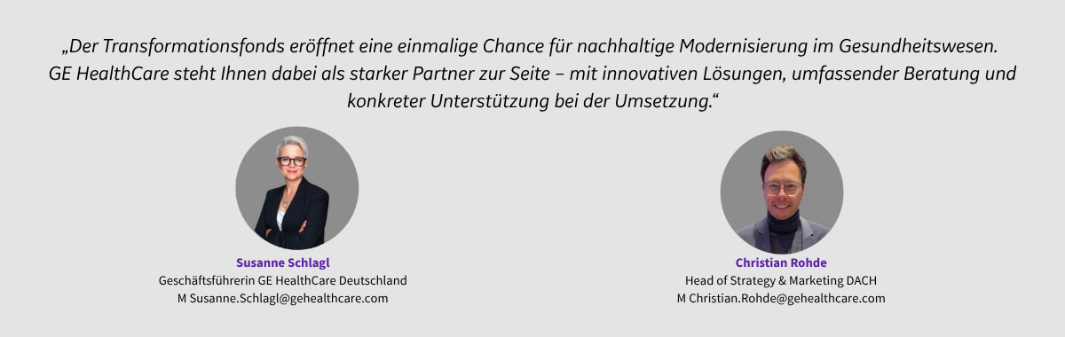 Der Transformationsfonds schafft die finanzielle Grundlage für nachhaltige Krankenhausreformen. GE HealthCare ergänzt diese durch innovative Technologien und Expertise, um die Qualität der Versorgung zu steigern, Digitalisierung voranzutreiben und sektorenübergreifende Zusammenarbeit zu fördern. Gemeinsam gestalten wir ein Gesundheitssystem, das auf Präzision, Effizienz und patientenzentrierte Versorgung setzt.