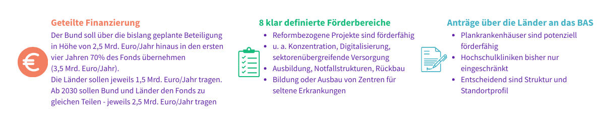 Die Förderung zielt insbesondere auf die Umstrukturierung zu „Level 1i“-Standorten ab, die primär ambulante Leistungen anbieten, aber auch stationäre Versorgung mit geringem medizinischem Risiko erbringen können.