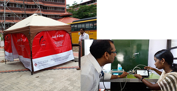 Figure 4, 5: The Kiosk includes a compact tent and branding material. As seen above, the community outreach program is titled "Just a Drop" - since a single drop of blood is all that needs to be drawn. On the right, Dr. Jaideep Menon, Head, Preventive Cardiology, AIMS is seen as willing volunteer during the commissioning of the system.