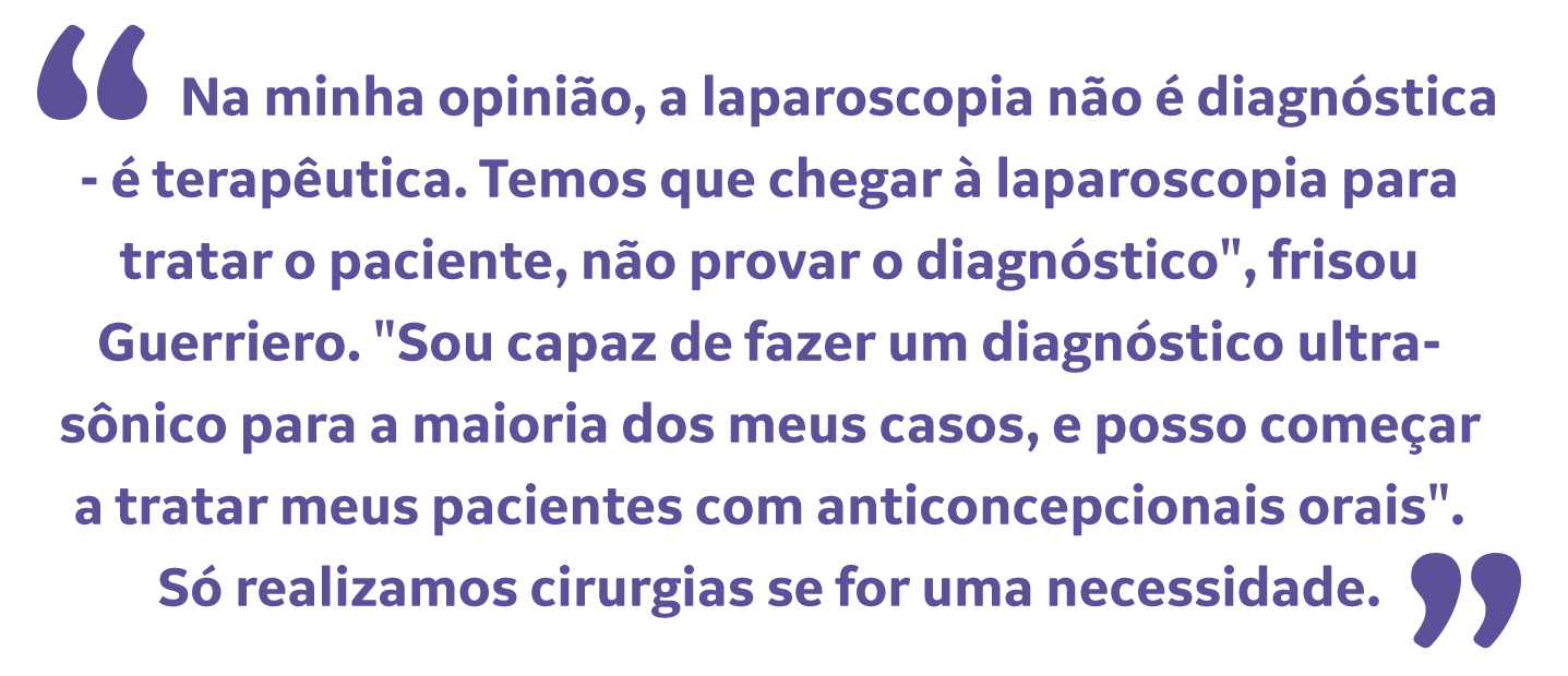 Embora muitos médicos recomendem a laparoscopia para um diagnóstico definitivo, a cirurgia não é necessária para iniciar o tratamento. Stefano Guerriero, M.D., Professor de Obstetrícia e Ginecologia da Universidade de Cagliari, diz que a laparoscopia é muito invasiva - e para seus pacientes, é sempre a ultrassonografia em primeiro lugar.